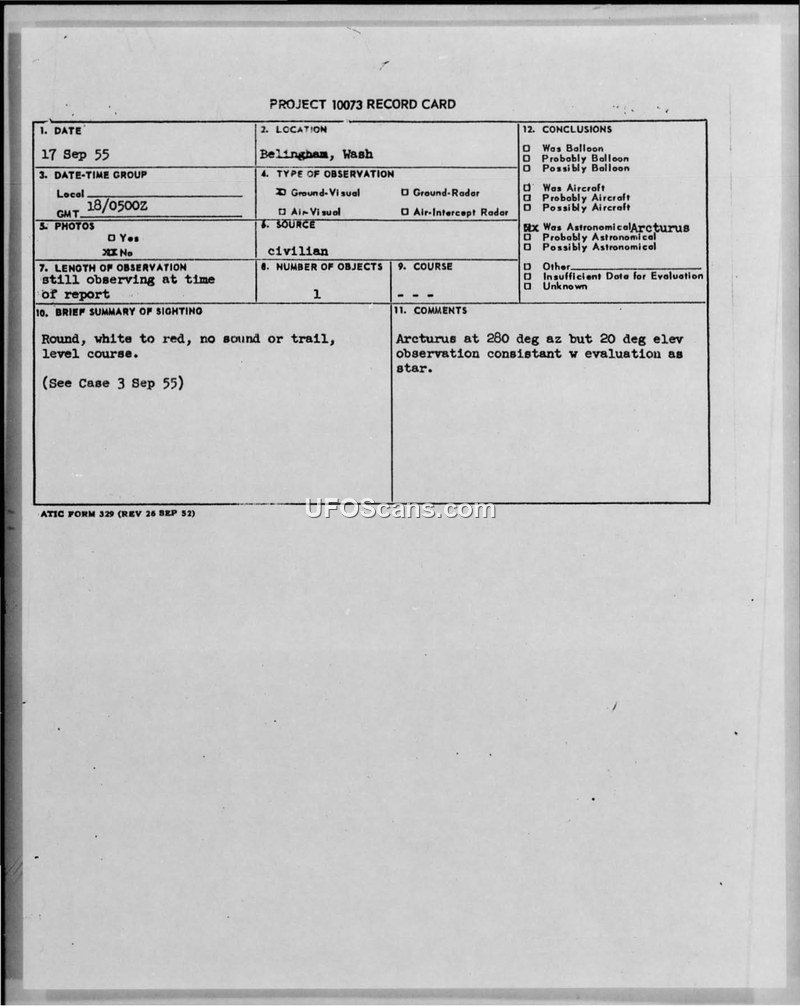 A civilian reported a UFO sighting in Bellingham, Washington, on September 17, 1955. The object was officially identified as the star Arcturus, with potential confusion caused by nearby military jet activity.