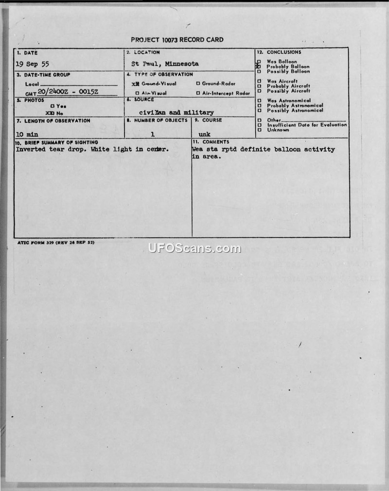 This document consists of a Project 10073 record card and a supporting teletype message regarding an Unidentified Aerial Phenomena (UAP) sighting that occurred in St. Paul, Minnesota, on September 19, 1955. The observation lasted approximately ten minutes, during which a single object described as an inverted teardrop with a bright white light in the center was reported. The object was described as having a nickel-like surface. The report notes that the sighting occurred at dusk, between 2400Z and 0015Z. The witnesses included children in a yard and an individual named La Fond. The report was filed by the Officer in Charge of Flight 2A, 4602D AISS, stationed at Snelling Air Force Station in St. Paul. The investigation concluded that the object was a balloon. This conclusion was supported by reports from weather stations in the area, which confirmed definite balloon activity at the time of the sighting. The document includes meteorological data for the area, noting partly cloudy conditions and rain. The report was transmitted to the Commander of the Air Defense Command at Ent Air Force Base in Colorado Springs, with an information copy sent to the 31st Air Division in St. Paul.