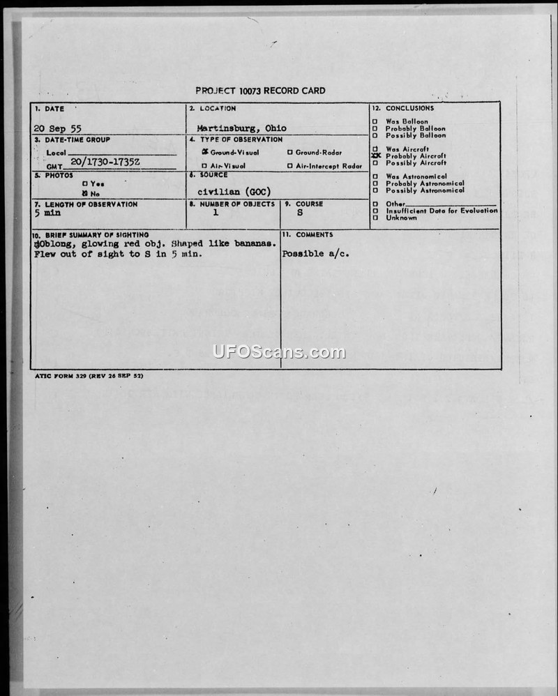 A civilian GOC observer in Martinsburg, Ohio, reported a glowing, banana-shaped object on September 20, 1955. The military investigation concluded the object was likely an aircraft.