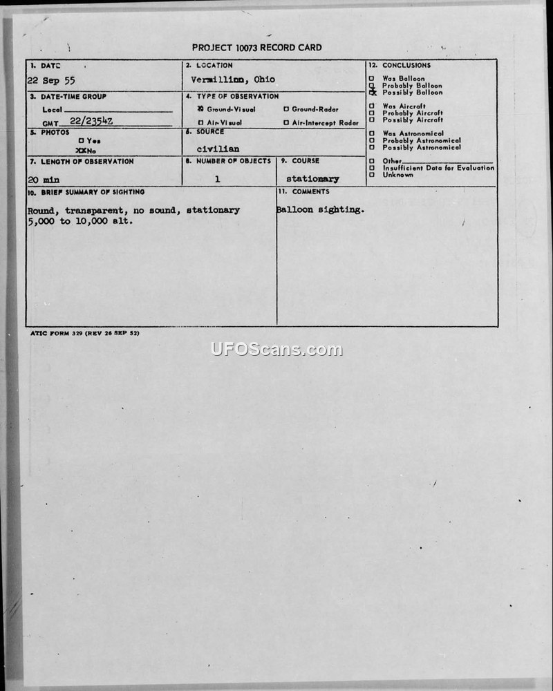 Project 10073 Record Card — Vermillion, Ohio, 22 Sep 55