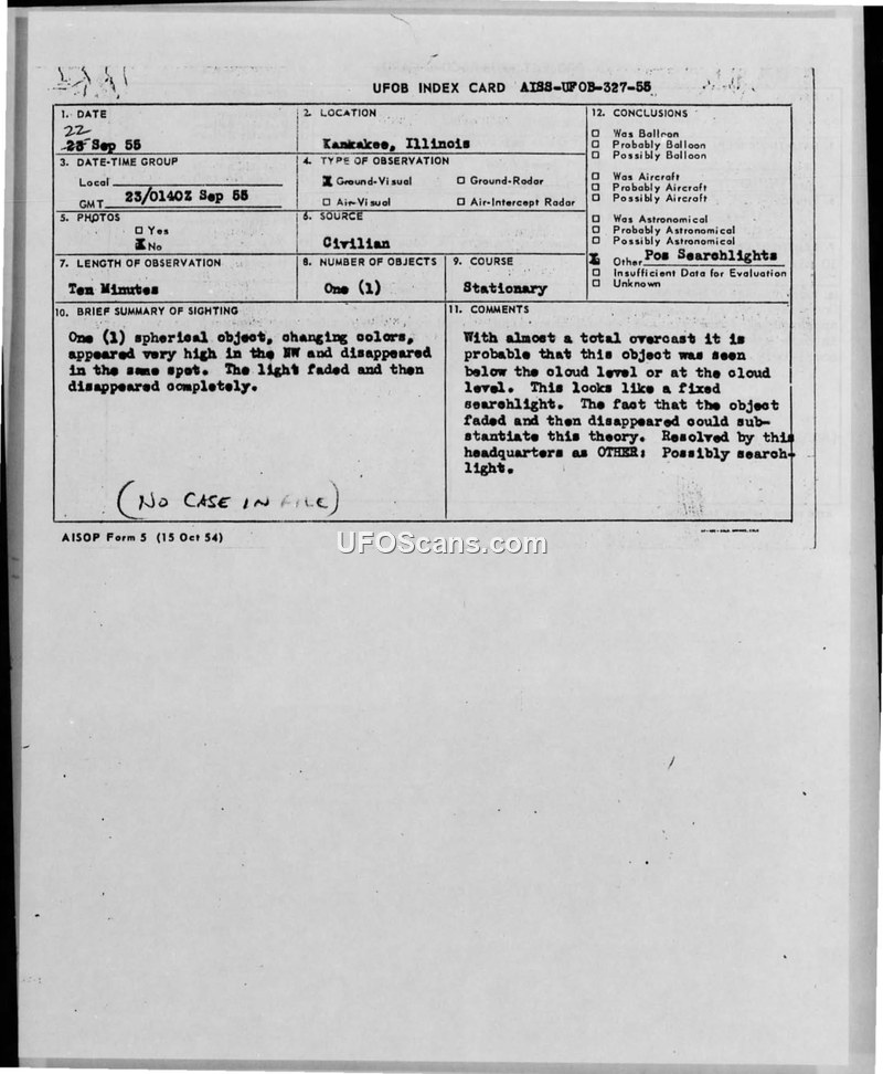 This document consists of two record cards, a UFOB Index Card (AI88-UFOB-327-55) and a Project 10073 Record Card, documenting a civilian sighting of an unidentified aerial phenomenon in Kankakee, Illinois, on September 22, 1955. The sighting occurred at 23/0140Z. The witness reported observing a single spherical object that exhibited changing colors. The object appeared at a high altitude in the northwest and remained stationary for approximately ten minutes before fading and disappearing completely in the same spot. The report notes that there was an almost total overcast at the time of the observation. Based on these conditions, the investigating headquarters concluded that the object was likely a fixed searchlight being reflected or observed against the cloud layer. The report explicitly states that there is 'no case in file' regarding this incident, suggesting it was closed without further investigation beyond the initial assessment.