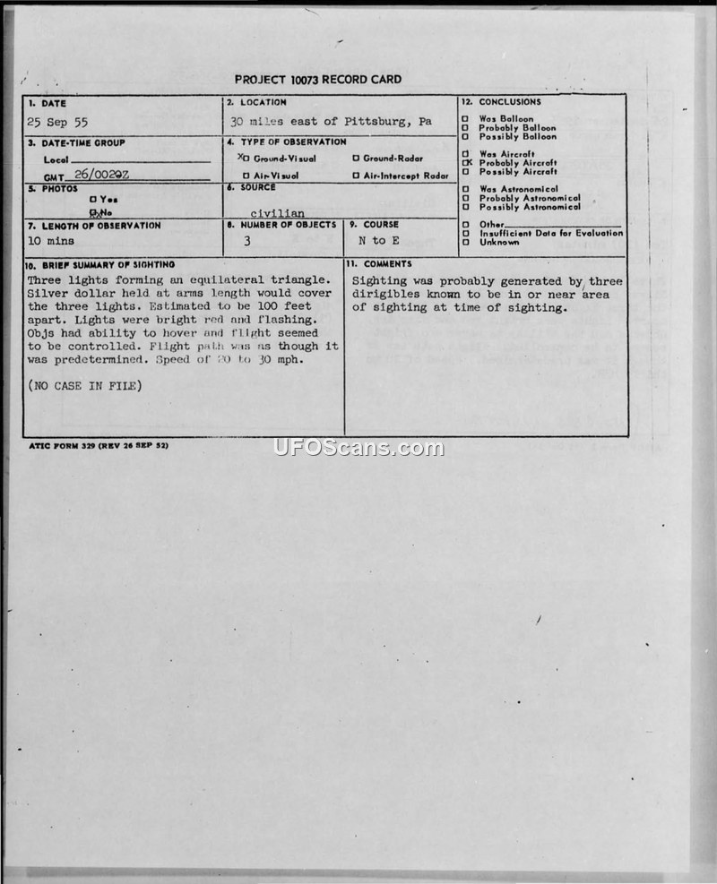 This document consists of two record cards from Project 10073, documenting a civilian sighting that occurred on September 25, 1955, approximately 30 miles east of Pittsburgh, Pennsylvania. The witness reported observing three bright, flashing red lights arranged in an equilateral triangle formation. The witness estimated the lights were 100 feet apart and noted that a silver dollar held at arm's length would cover the entire formation. The objects were observed for a duration of 10 minutes, during which they demonstrated the ability to hover and exhibited a controlled flight path from the north to the east at an estimated speed of 20 to 30 miles per hour. The report explicitly states that there is no case file associated with this incident. The official conclusion reached by the evaluating officers is that the sighting was likely caused by three dirigibles known to be operating in or near the area at the time of the observation. This conclusion was supported by the preparing officer and documented via AF Form 112. The record cards confirm that no photographs were taken and there was no radar contact associated with the event.