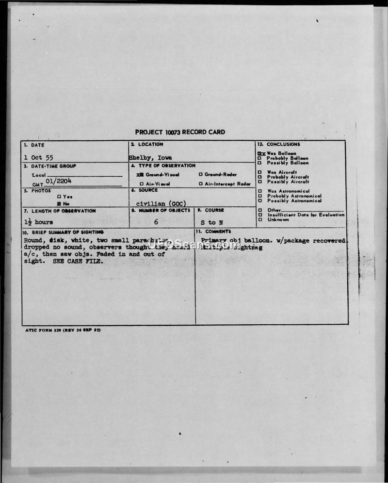 On 1 October 1955, two 15-year-old Ground Observer Corps (GOC) observers, Miss Merva Farr and Miss Janet Wolrenbach, reported a series of unidentified aerial phenomena near Shelby, Iowa. The witnesses described observing six spherical, white, shiny objects over a period of one and a half hours. The objects were reported to move from the southwest to the northwest. During the initial observation, one object appeared to divide and release a small parachute. The witnesses reported that they initially thought they heard an aircraft, but the objects themselves made no sound. The incident was investigated by Captain Hans Bischofs and S/Sgt. Billie R. McCreary of Detachment 2, 4602D AISS. Supplementary investigative efforts included a search for the reported parachute, which was successfully located by a local farmer's son approximately three and a half miles northeast of the observation point. The recovered item was identified as a standard radiosonde weather balloon package. Meteorological data for the area was reviewed, and a check of the GOC aircraft log confirmed that five aircraft were in the vicinity during the time of the sighting. Two fighter interceptors were dispatched from Sioux City, Iowa, to check the area, but they reported seeing nothing unusual. In his final assessment, Captain Bischofs concluded that the sighting was likely caused by a weather balloon. He hypothesized that the balloon, released from a weather station in Omaha, Nebraska, had developed a leak, causing it to descend with its equipment, then rise again after releasing the weight of the parachute and radiosonde. He noted that the shiny appearance was likely due to the reflection of the sun on the white balloon material. While acknowledging the difficulty in explaining the specific movement patterns reported by the observers, the report ultimately attributed the sighting to the weather balloon and the observers' lack of technical experience, suggesting that their imagination may have led them to report more than was actually present. The approving officer, Colonel John M. White Jr., concurred with these findings.
