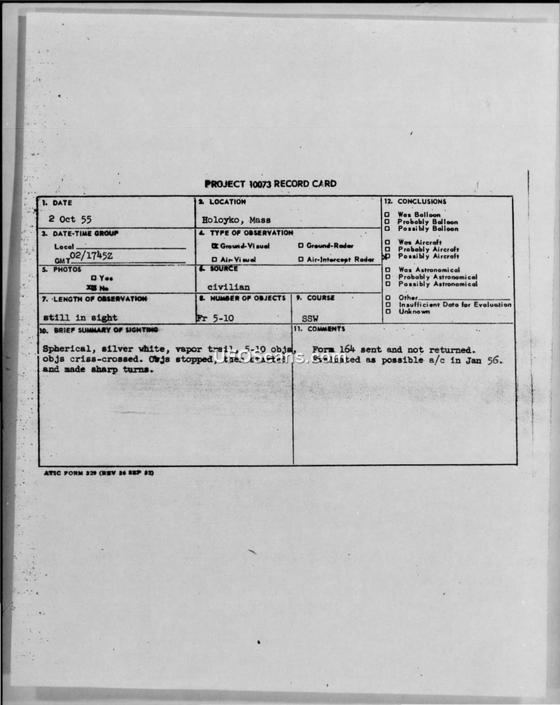 Project 10073 Record Card - Holyoke, Mass - 2 Oct 55