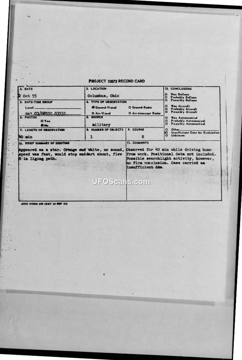 A 1955 sighting report from Columbus, Ohio, involving an unidentified object described as a fast-moving, zigzagging orange and white star. The case was officially closed as having insufficient data for evaluation, with a note suggesting possible searchlight activity.