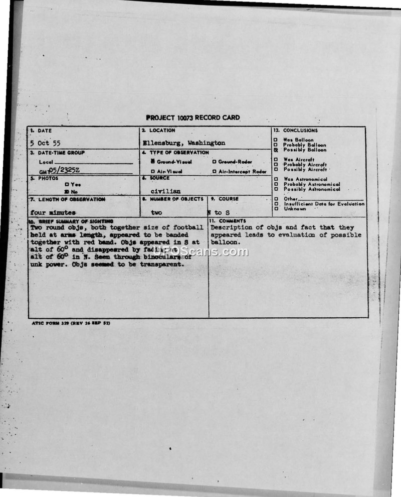 PROJECT 10073 RECORD CARD - Ellensburg, Washington - 5 Oct 55