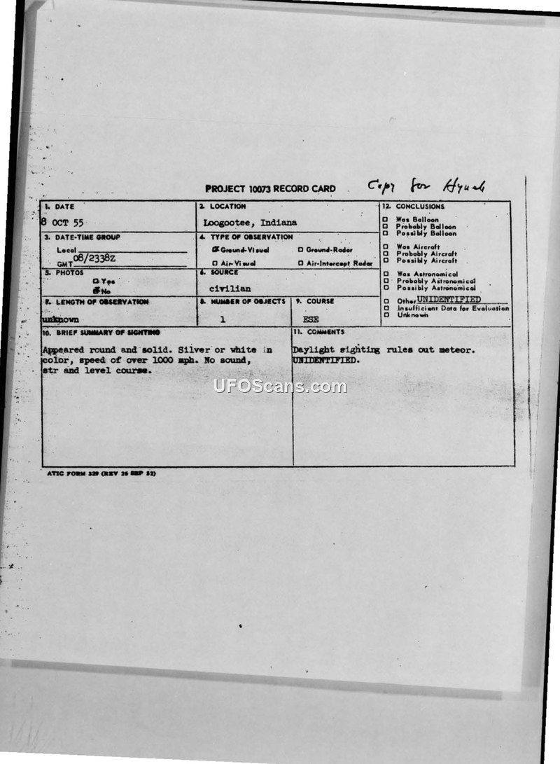 A reliable U.S. Navy employee reported a high-speed, silent, round, silver object over Loogootee, Indiana, on 8 October 1955. The sighting was officially classified as 'UNIDENTIFIED' by the Air Technical Intelligence Center.