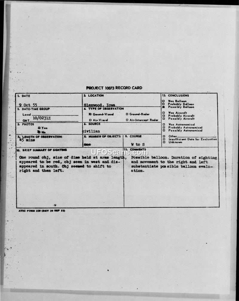 Two UFO sighting reports from Glenwood, Iowa, on October 9, 1955, were investigated by the 739th AC&W Squadron. Both incidents were officially classified as 'insufficient data' with a likely explanation of balloons.