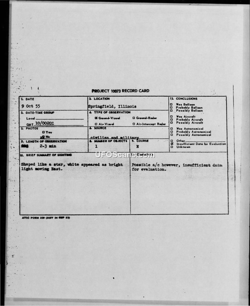 Project 10073 Record Card — Springfield, Illinois, 9 Oct 55