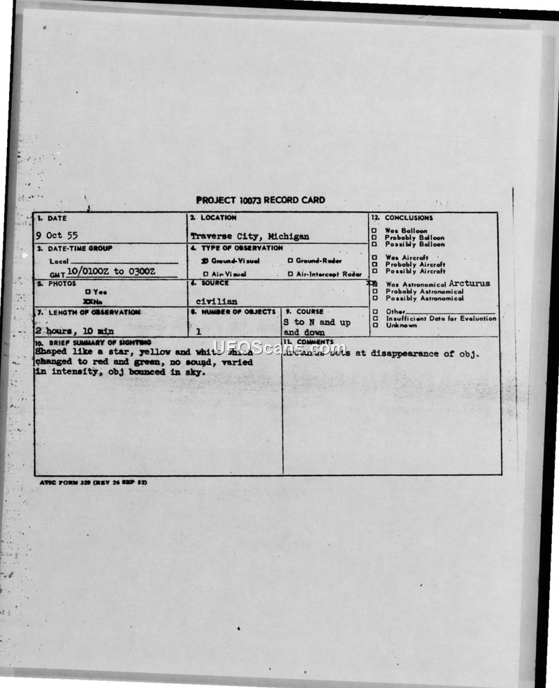 Project 10073 Record Card — Traverse City, Michigan, 9 Oct 55