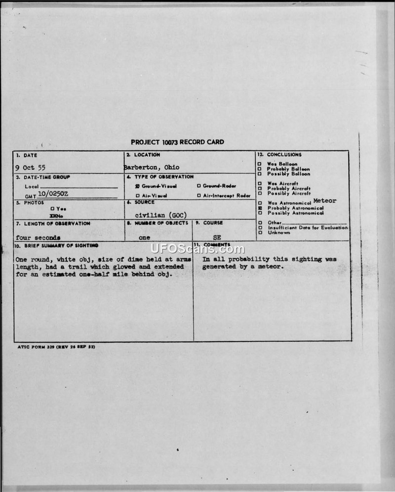 Project 10073 Record Card — Barberton, Ohio, 9 Oct 55