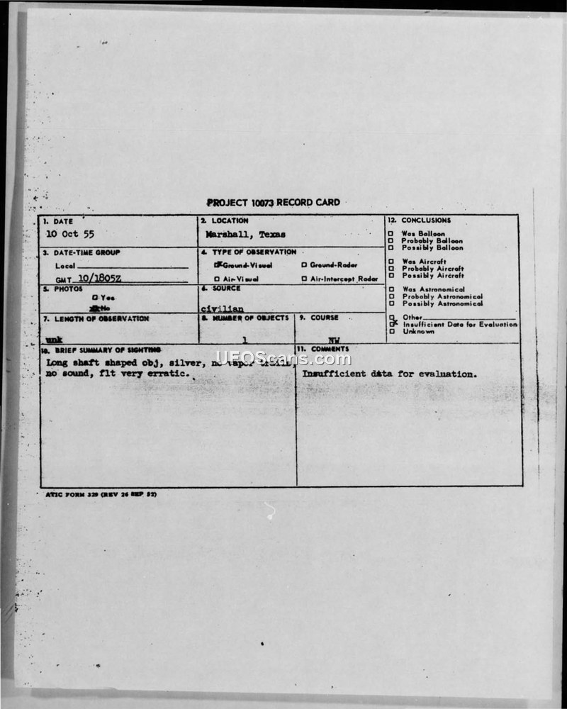 Project 10073 Record Card - Marshall, Texas - 10 Oct 55