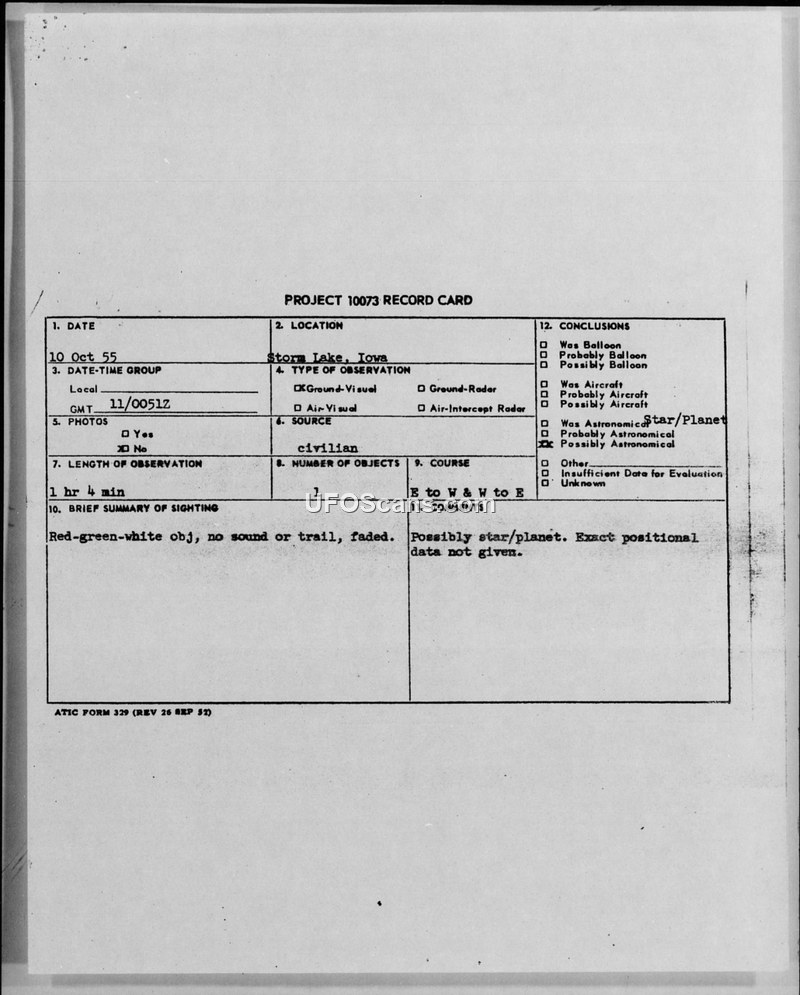Project 10073 Record Card: Sighting at Storm Lake, Iowa, 10 October 1955