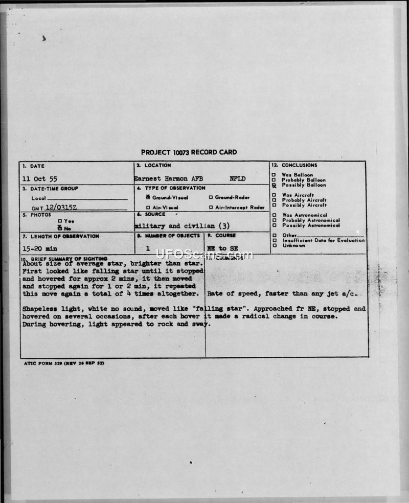 Project 10073 Record Card and Augmented UFO Report — Earnest Harmon AFB, October 1955