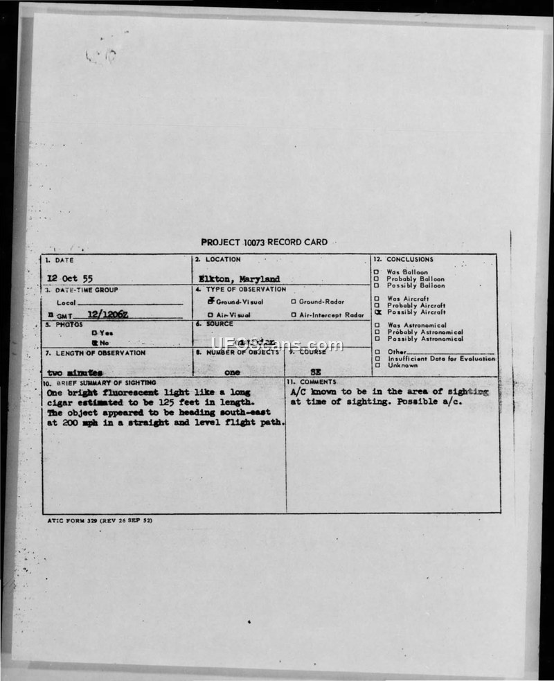 Project 10073 Record Card — Elkton, Maryland, 12 October 1955