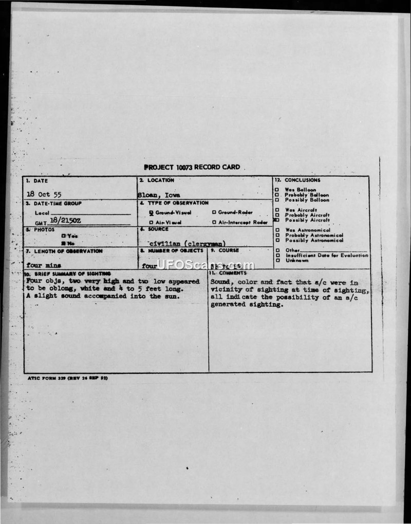 A 1955 sighting report from Sloan, Iowa, involving four oblong objects observed by a clergyman. The military concluded the objects were likely aircraft.