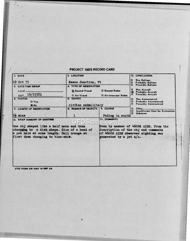 Project 10073 Record Card: Sighting at Essex Junction, VT, 19 October 1955
