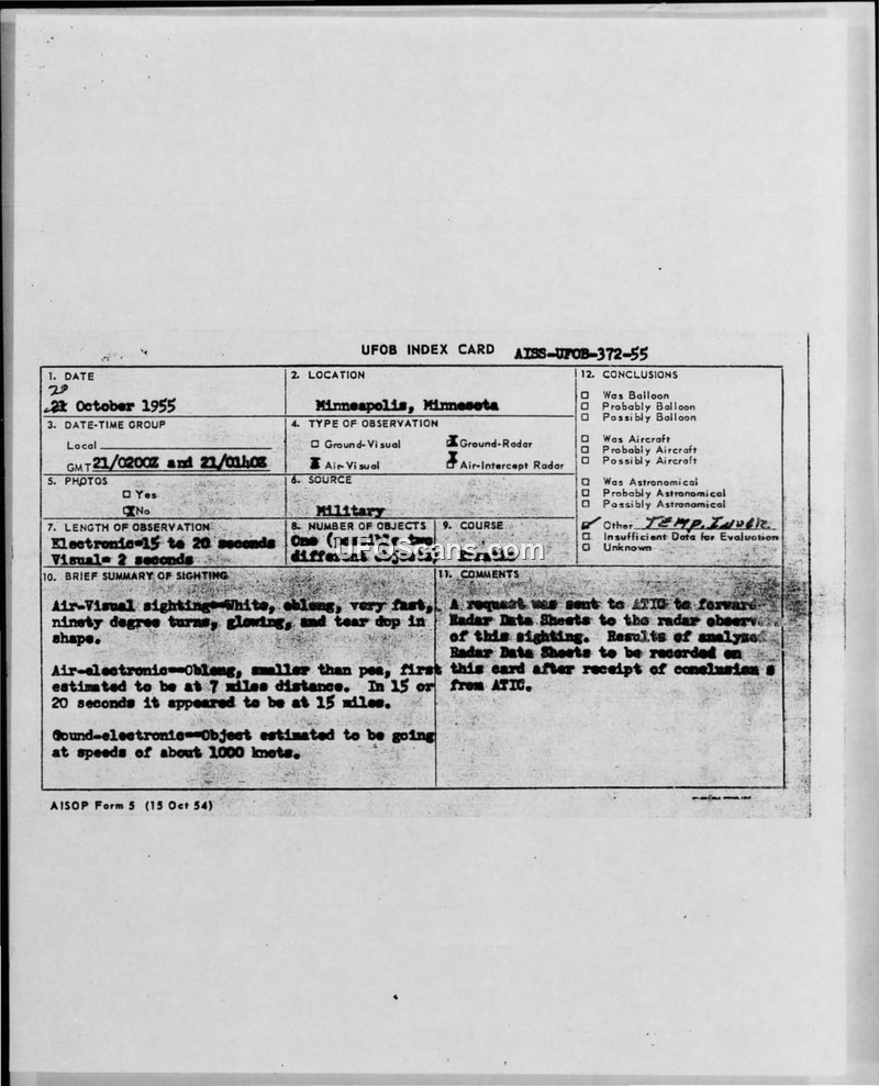 A 1955 sighting report from Minneapolis, Minnesota, involving both visual and radar observations of an oblong object. The official conclusion attributed the event to a temperature inversion.