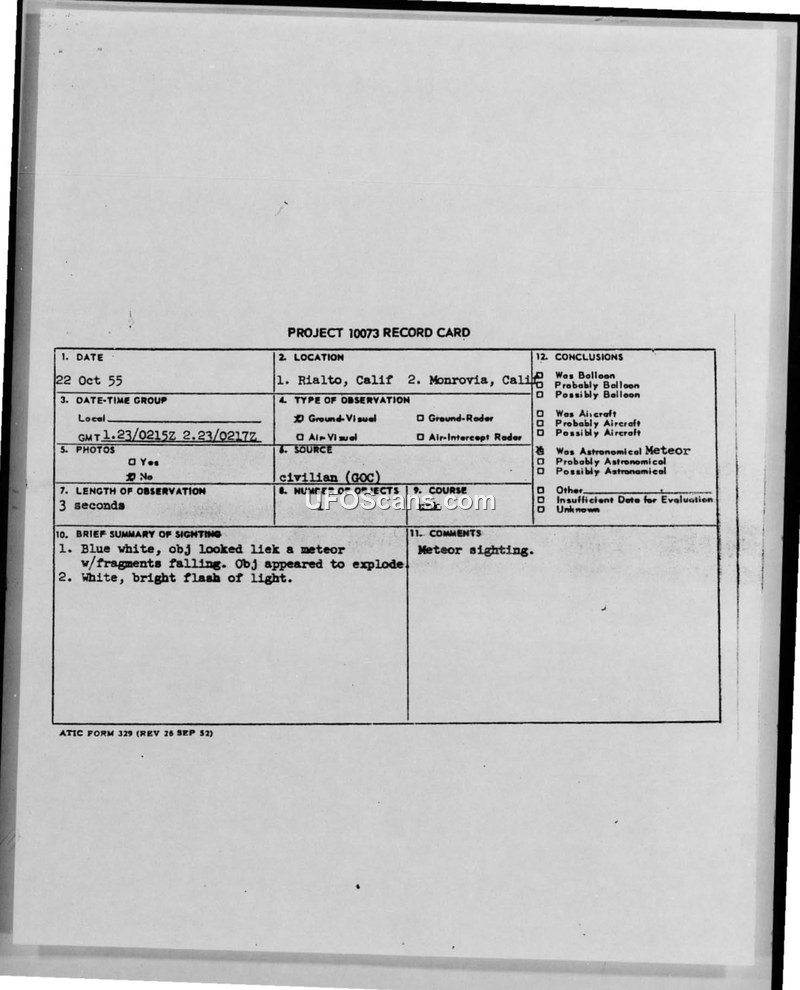 Military reports from October 1955 document a sighting of a blue-white object over California, which was officially identified as an astronomical meteor. The reports were filed by the 669th Aircraft Control and Warning Squadron.