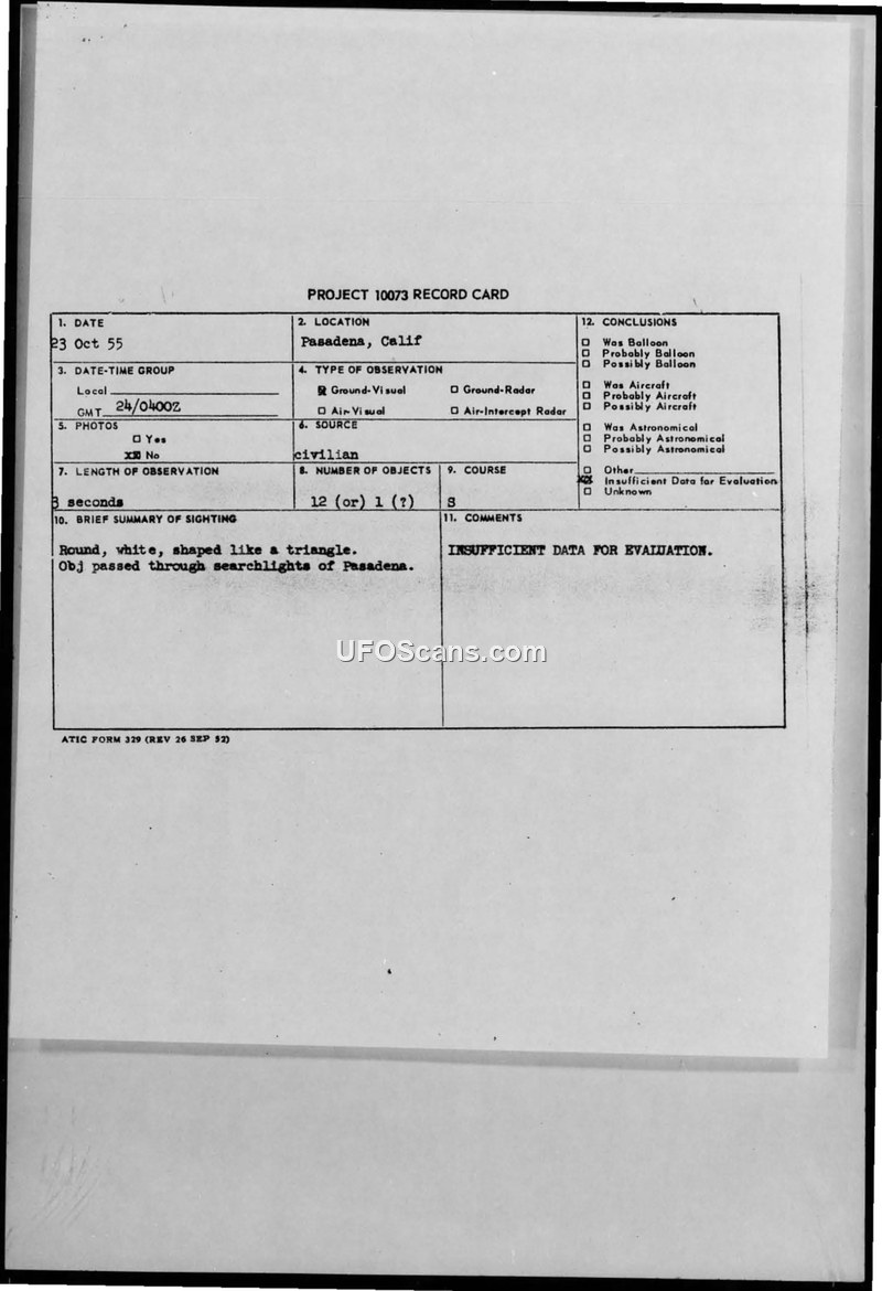 A civilian engineer reported a three-second sighting of a white, triangular-shaped object in Pasadena on October 23, 1955. The military investigation concluded there was insufficient data to evaluate the incident.