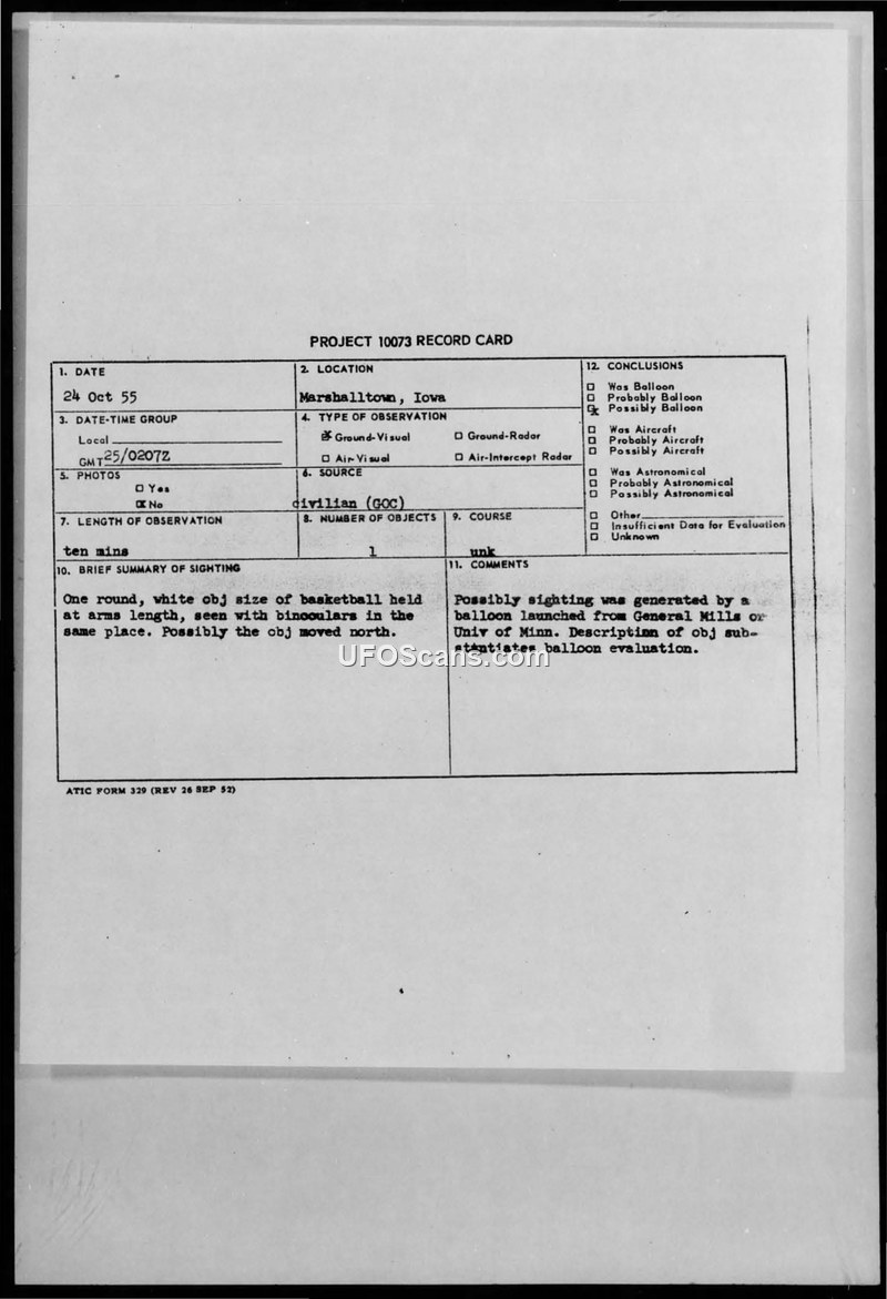 A civilian reported a round, white, basketball-sized object in Marshalltown, Iowa, on October 24, 1955. Military investigators concluded the object was likely a balloon launched by General Mills or the University of Minnesota.