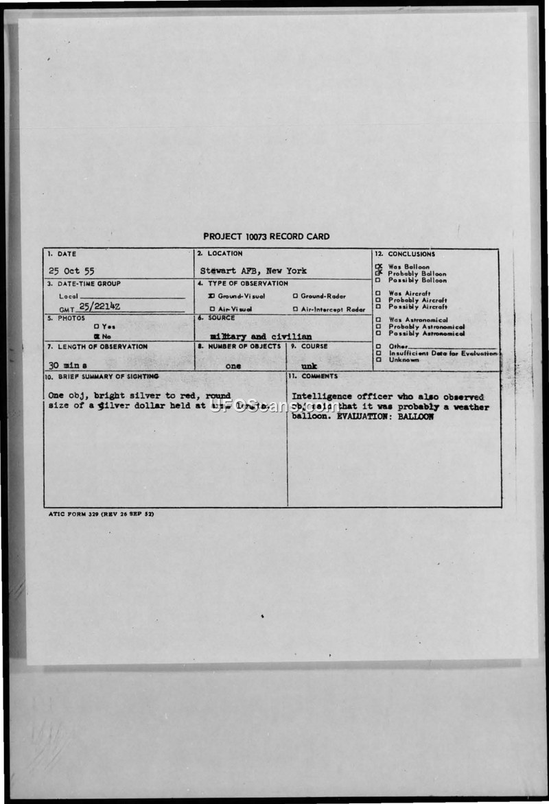 Project 10073 Record Card — Stewart AFB, New York, October 25, 1955