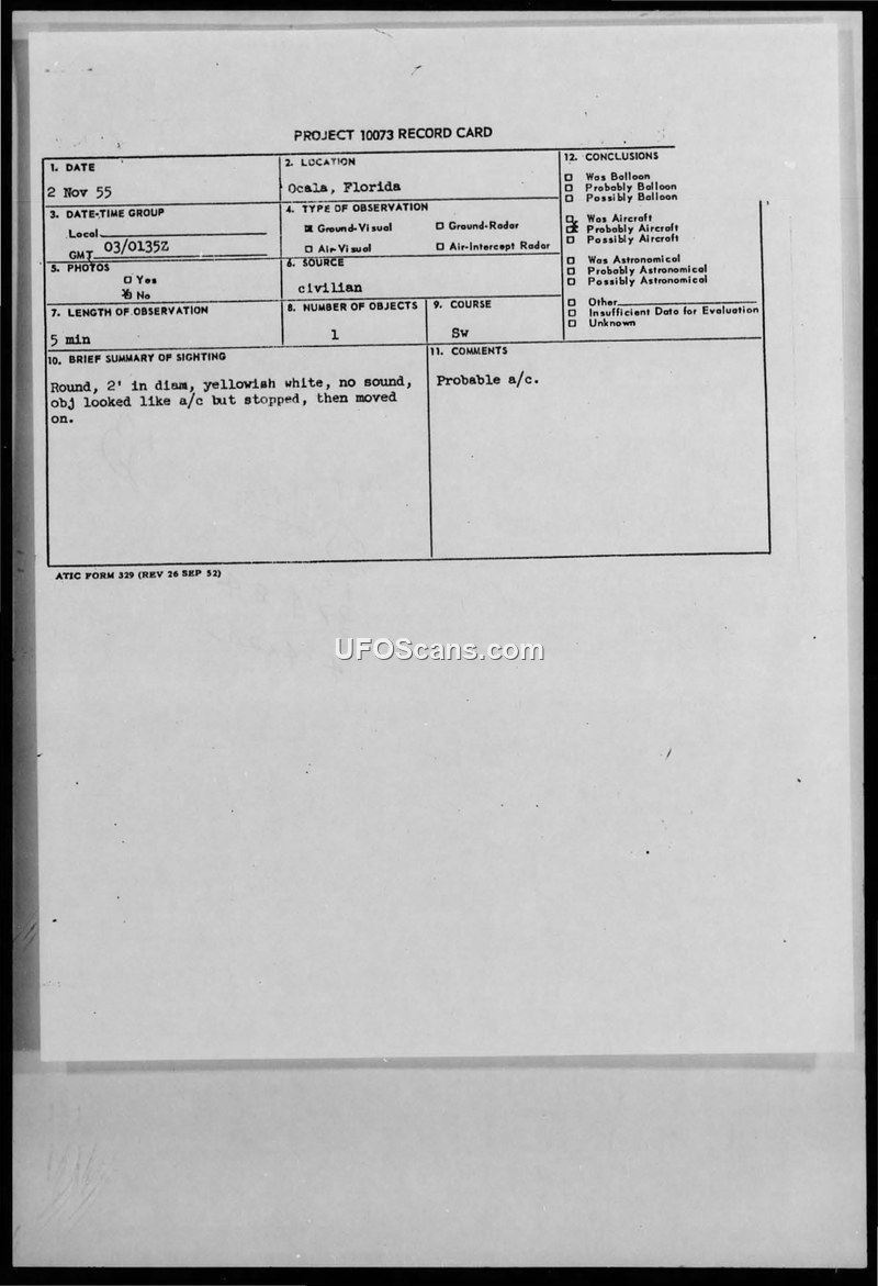 Project 10073 Record Card — Ocala, Florida, 2 Nov 55
