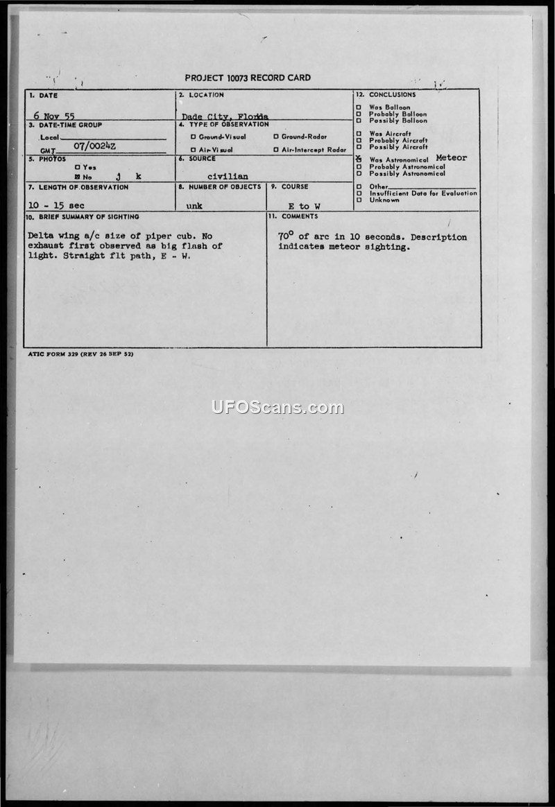 Project 10073 Record Card — Dade City, Florida, 6 November 1955