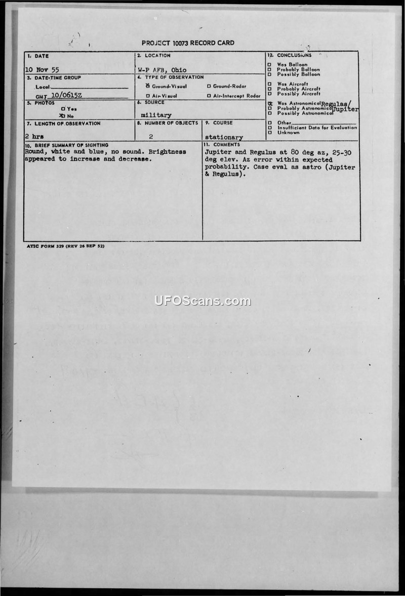 Project 10073 Record Card — W-P AFB, Ohio, 10 Nov 55