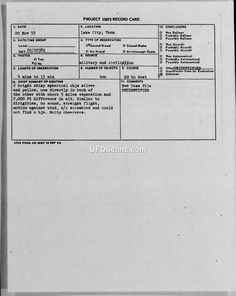 Project 10073 Record Card and Supplement to AF Form 112 — Lake City, Tennessee, 20 November 1955