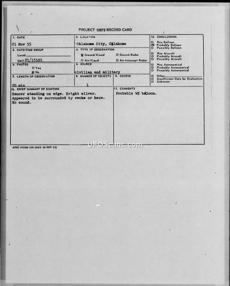 PROJECT 10073 RECORD CARD - 21 NOV 55 - OKLAHOMA CITY, OKLAHOMA