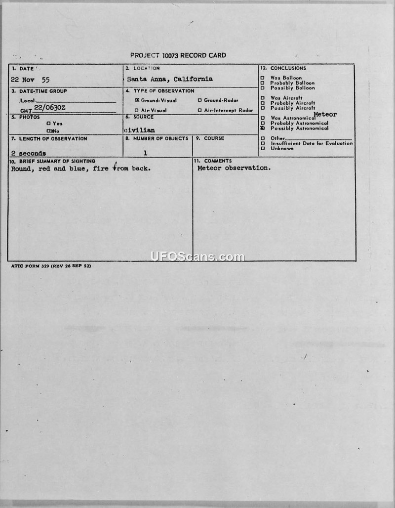 PROJECT 10073 RECORD CARD - Santa Anna, California - 22 Nov 55