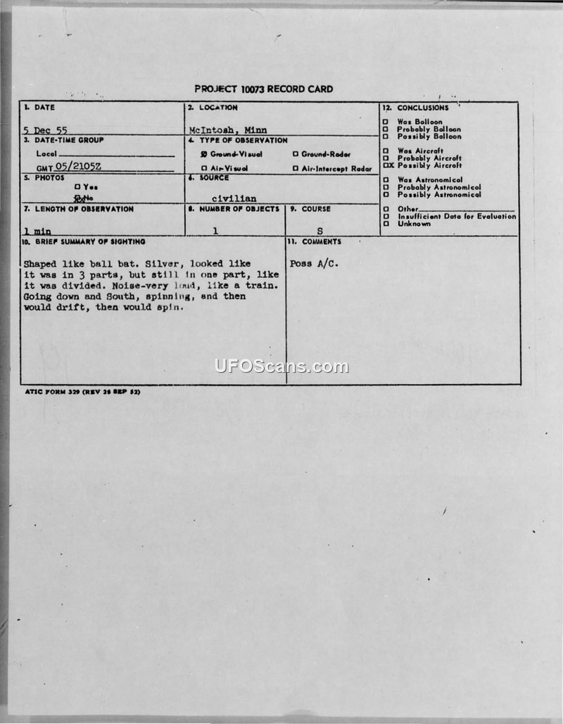 This document collection contains records regarding a UFO sighting that occurred on December 5, 1955, in McIntosh, Minnesota. The primary record is a Project 10073 Record Card, which documents a report from a female witness who observed a silver, bat-shaped object. The witness described the object as appearing to be in three parts, though still a single entity, and noted that it produced a very loud noise, similar to a train. The object was observed for approximately one minute, during which it moved south, spinning and drifting. The official conclusion recorded on the card is 'Possibly Aircraft.' The file also includes correspondence from 1969, in which a different individual, an assistant civil engineer from Oroville, California, writes to Dr. Edward U. Condon regarding a separate, personal UFO sighting experience from 1955. This individual describes a high-speed object entering the atmosphere at a steep angle, which they observed while driving near San Jose, California. The author of this letter expresses concern about the conclusions of the Condon Report and seeks to have their sighting documented. The final document in the file is a response from Lt. Col. Hector Quintanilla, Jr., of the Aerospace Technologies Division, acknowledging the report but noting that the sighting is too old to investigate, though it will be included in Air Force files for information purposes.