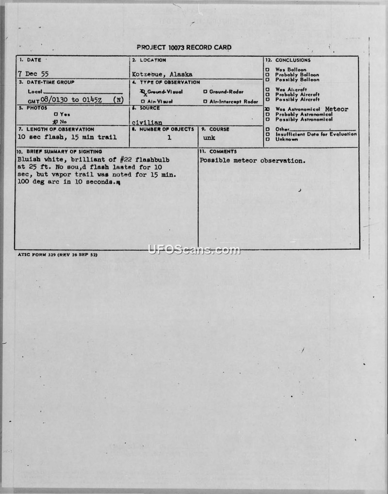This report documents a 1955 sighting of a brilliant, unidentified light in Kotzebue, Alaska, which left a 15-minute vapor trail. Despite investigations into weather and radar data, the object remained unidentified, though it was possibly a meteor.