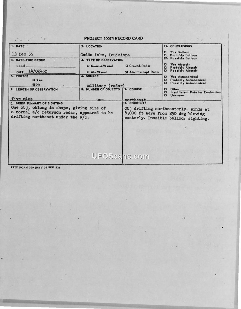 Project 10073 Record Card — Caddo Lake, Louisiana, 13 December 1955