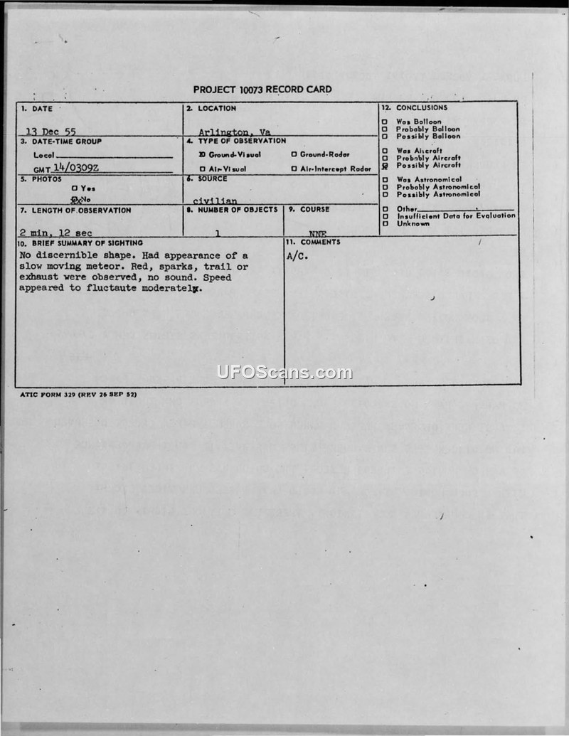 Project 10073 Record Card and Associated Sighting Report — Arlington, Virginia, 13 December 1955