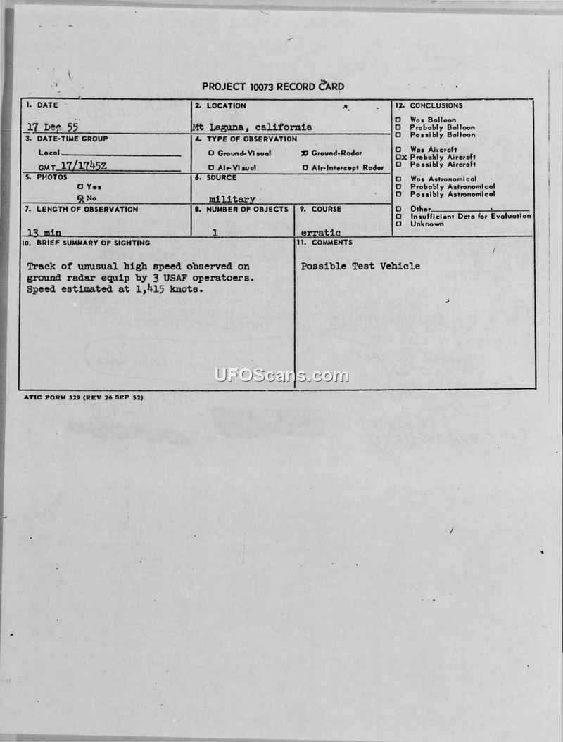 PROJECT 10073 RECORD CARD - 17 December 1955