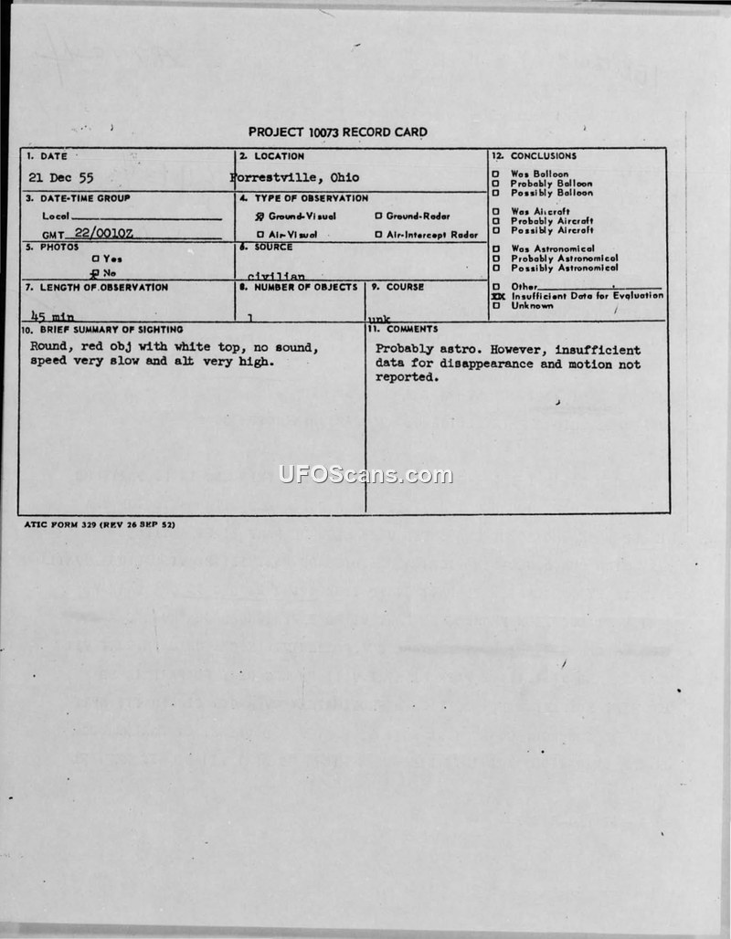 Project 10073 Record Card - Forrestville, Ohio - 21 Dec 55