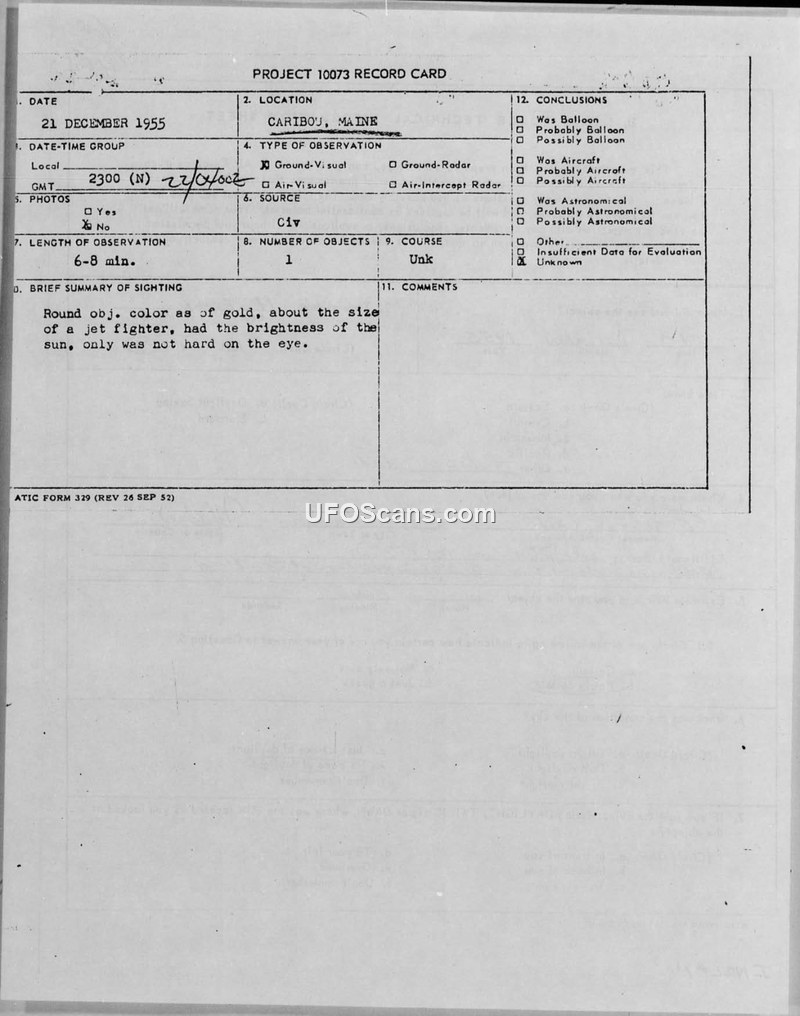 Project 10073 Record Card - Caribou, Maine, 21 December 1955