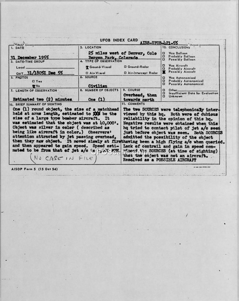 UFOB Index Card — 25 miles west of Denver, Colorado, 31 December 1955