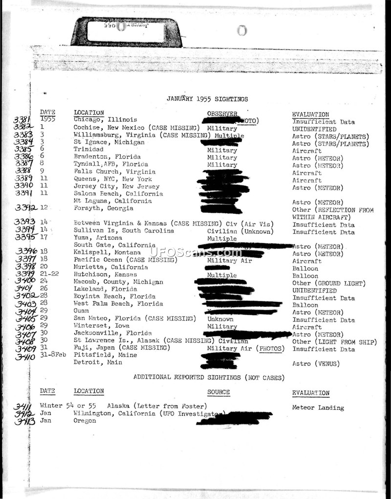 Monthly Sightings Reports: January 1955 – December 1955