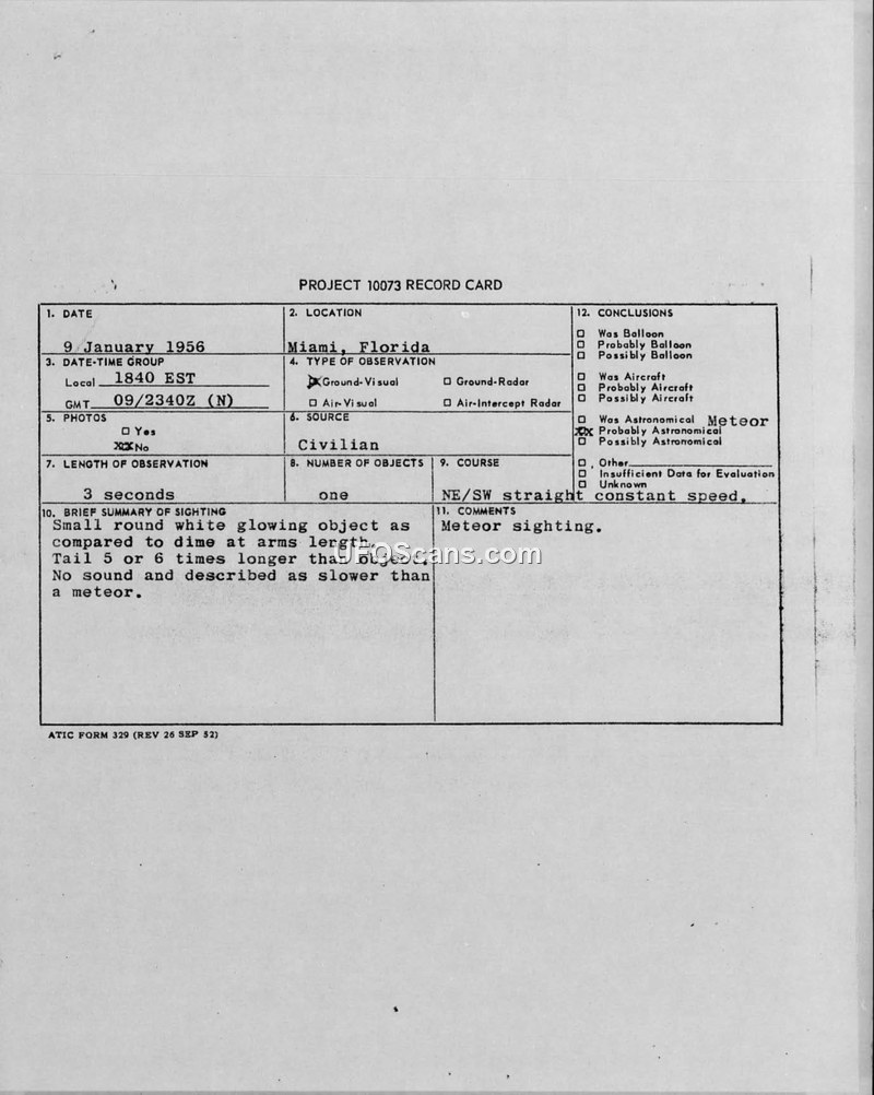 PROJECT 10073 RECORD CARD - 9 JANUARY 1956 - MIAMI, FLORIDA