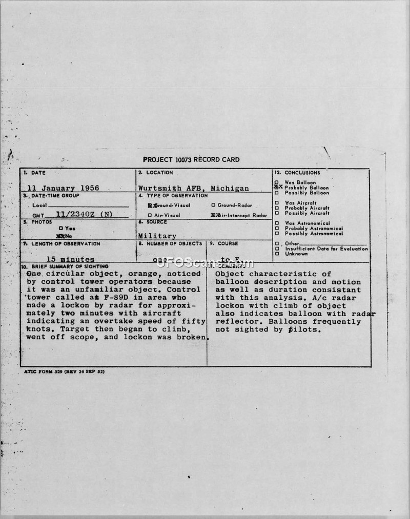 On 11 January 1956, personnel at Wurtsmith AFB observed an unidentified object that was also tracked by an F-89D interceptor's radar. The official investigation concluded the sighting was likely an optical and radar phenomenon caused by a temperature inversion.