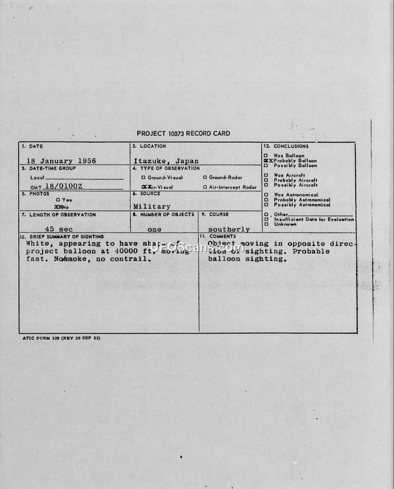 Project 10073 Record Card — Itazuke, Japan, 18 January 1956