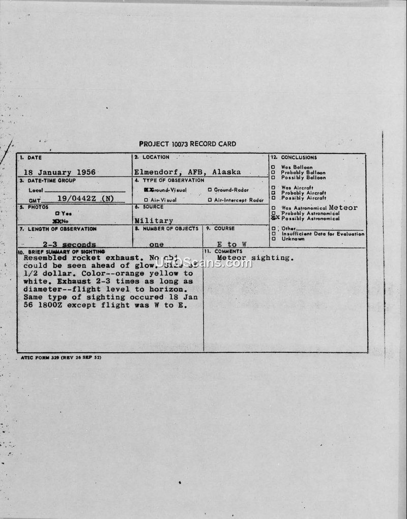 PROJECT 10073 RECORD CARD - ELMENDORF AFB, ALASKA - 18 JANUARY 1956