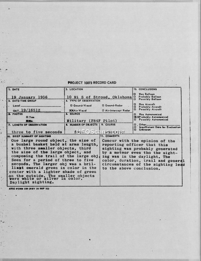 On January 19, 1956, at 1651Z, an F-84F military pilot reported a sighting of four objects while flying ten miles south of Stroud, Oklahoma. The pilot described one large, round object, estimated to be the size of a bushel basket held at arm's length, accompanied by three smaller objects that were approximately one-third the size of the primary object. The large object was described as a brilliant emerald green in the center with a lighter shade of green on the outside, appearing fuzzy at the edges and comparable to a large green pyrotechnic flare. The three smaller objects were white or silver in color and appeared to be trailing the larger object. The sighting lasted for three to five seconds, during which the objects maintained a straight and level flight path on an easterly heading. The pilot was flying at 440 knots true airspeed, and the objects were observed at a slightly higher altitude. A GCI unit was contacted to provide a fix on the observer's position and to check for radar returns, but the radar reported negative results. The official conclusion reached by the reporting authorities was that the sighting was likely caused by a meteor, despite the fact that it occurred during daylight hours. This conclusion was based on the observed color, the duration of the event, the presence of a trail, and the general circumstances of the sighting. The observer pilot noted that while they had seen falling celestial bodies on previous occasions, they had never witnessed one with such a brilliant color.
