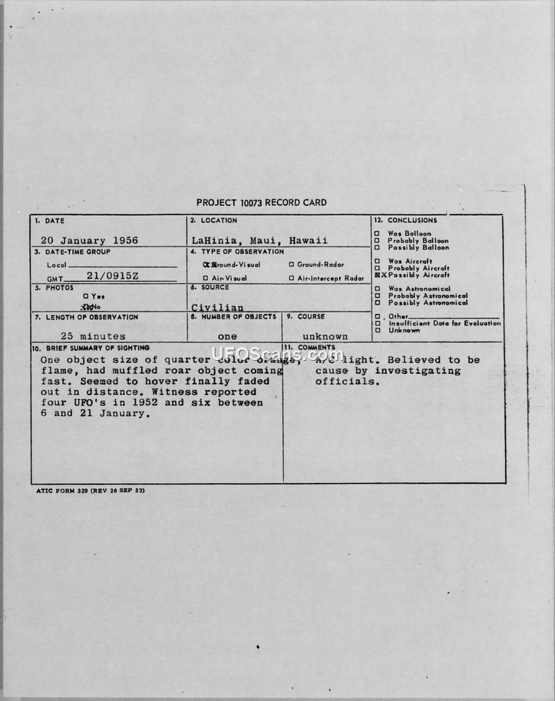 Project 10073 Record Card and Air Intelligence Information Report — LaHinia, Maui, Hawaii, 20 January 1956