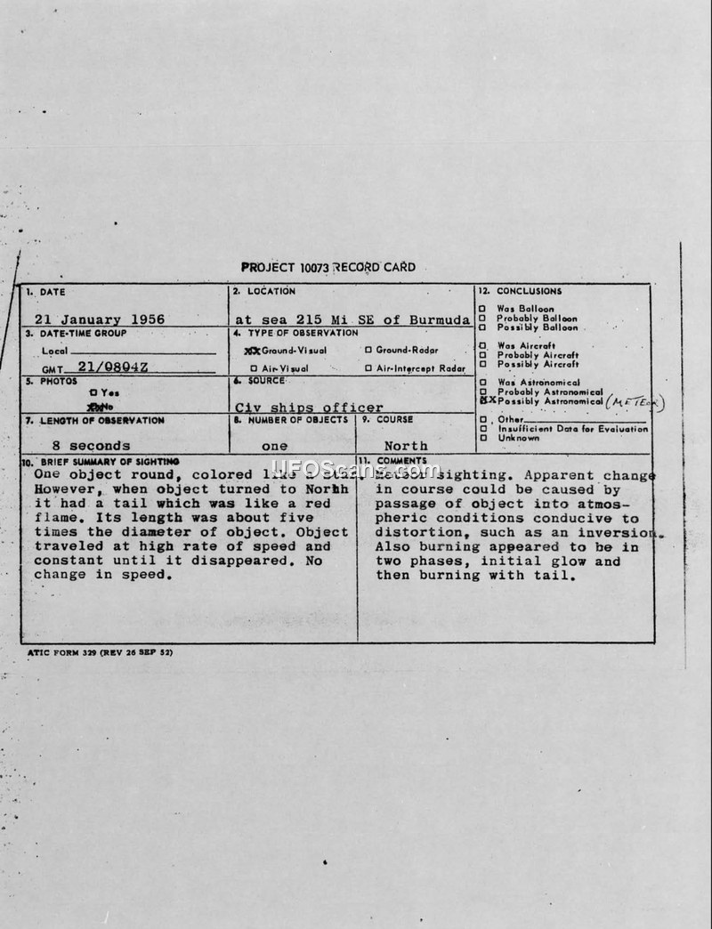 This document details an unidentified flying object sighting reported by the Second Mate of the Danish vessel DANFJORD on January 21, 1956. The vessel was located approximately 215 miles southeast of Bermuda at the time of the incident. The witness, a 35-year-old mariner with 15 years of sea experience, observed a round, star-like object that initially appeared to be a 'falling star.' The object hovered for one or two seconds before executing an abrupt right-angle turn to the north, moving at a high rate of speed without visible acceleration. During this maneuver, a long, flame-red tail, approximately five times the length of the object's body, became visible. The witness noted that while he had seen V-2 rockets during World War II, he had never observed a celestial or man-made object capable of such performance or the ability to transition from a star-like appearance to a rocket-like appearance. The weather was reported as clear with high visibility. The report was processed by the District Intelligence Officer of the Sixth Naval District and forwarded to the Office of Naval Intelligence, which subsequently transmitted the information to the U.S. Air Force. A Project 10073 record card associated with the report concludes that the sighting was likely a meteor, suggesting that the observed maneuvers and appearance were the result of atmospheric distortion, such as an inversion, and the burning phases of the object. The file includes a memo routing slip directing the report to be shown to J. Allen Hynek.