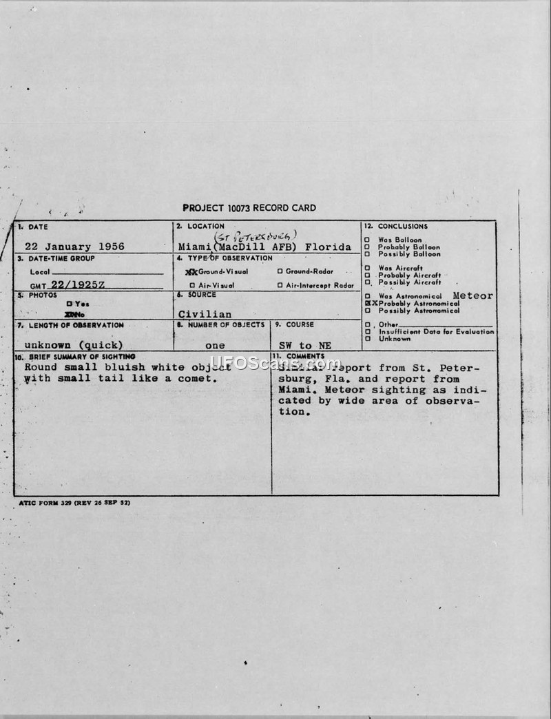 On January 22, 1956, a bluish-white object with a tail was sighted over the Gulf of Mexico by a Pan American flight engineer and residents in Florida. Military investigators concluded the object was a meteor.