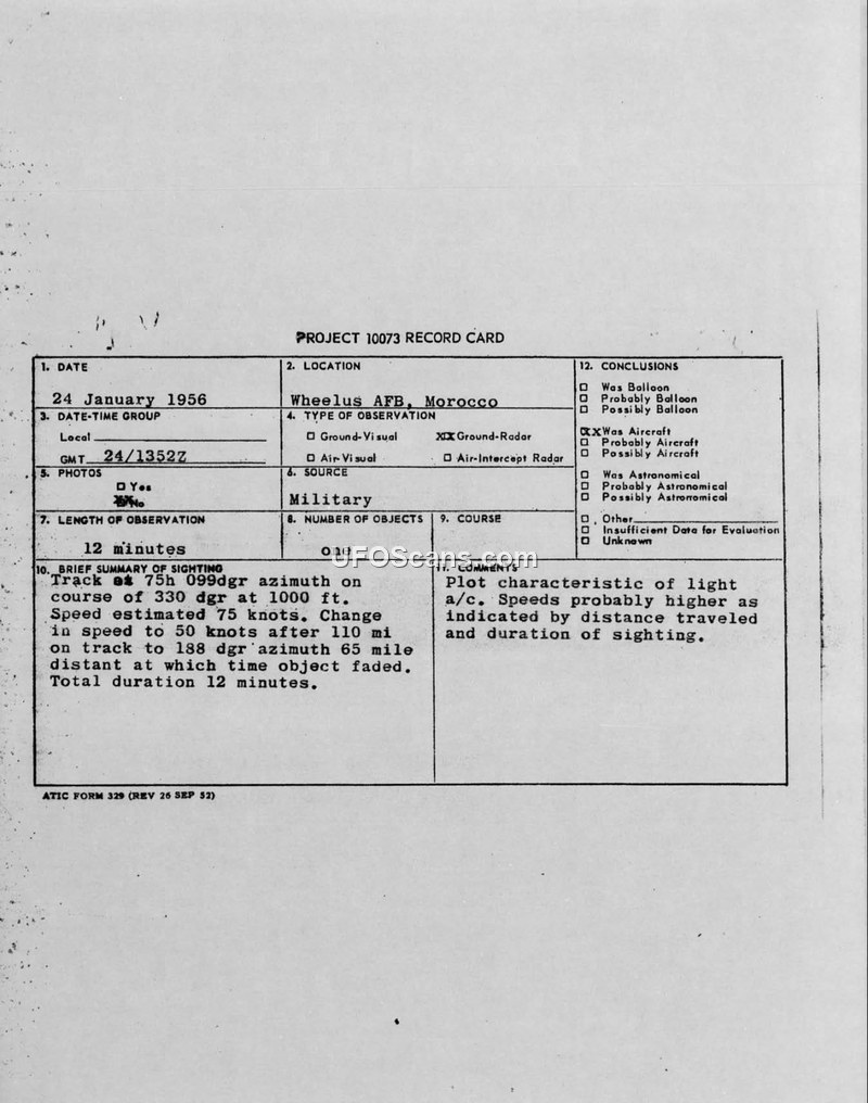 On January 24, 1956, at 1352Z, a radar station at Wheelus Air Force Base in Morocco tracked an unidentified object. The object was initially detected at a 099-degree azimuth on a course of 330 degrees at an altitude of 1,000 feet. The object maintained an estimated speed of 75 knots for a portion of its flight. After traveling 110 miles, the object changed its speed to 50 knots and shifted its track to a 188-degree azimuth. The object was tracked for a total of 12 minutes before it faded from radar at a distance of 65 miles. Following a complete check of the data, military officials discounted the possibility that the object was a weather balloon. The final conclusion recorded on the Project 10073 record card classified the object as an aircraft, noting that the plot characteristics were consistent with light aircraft, although the actual speed may have been higher than the initial estimate given the distance covered during the 12-minute duration of the sighting.